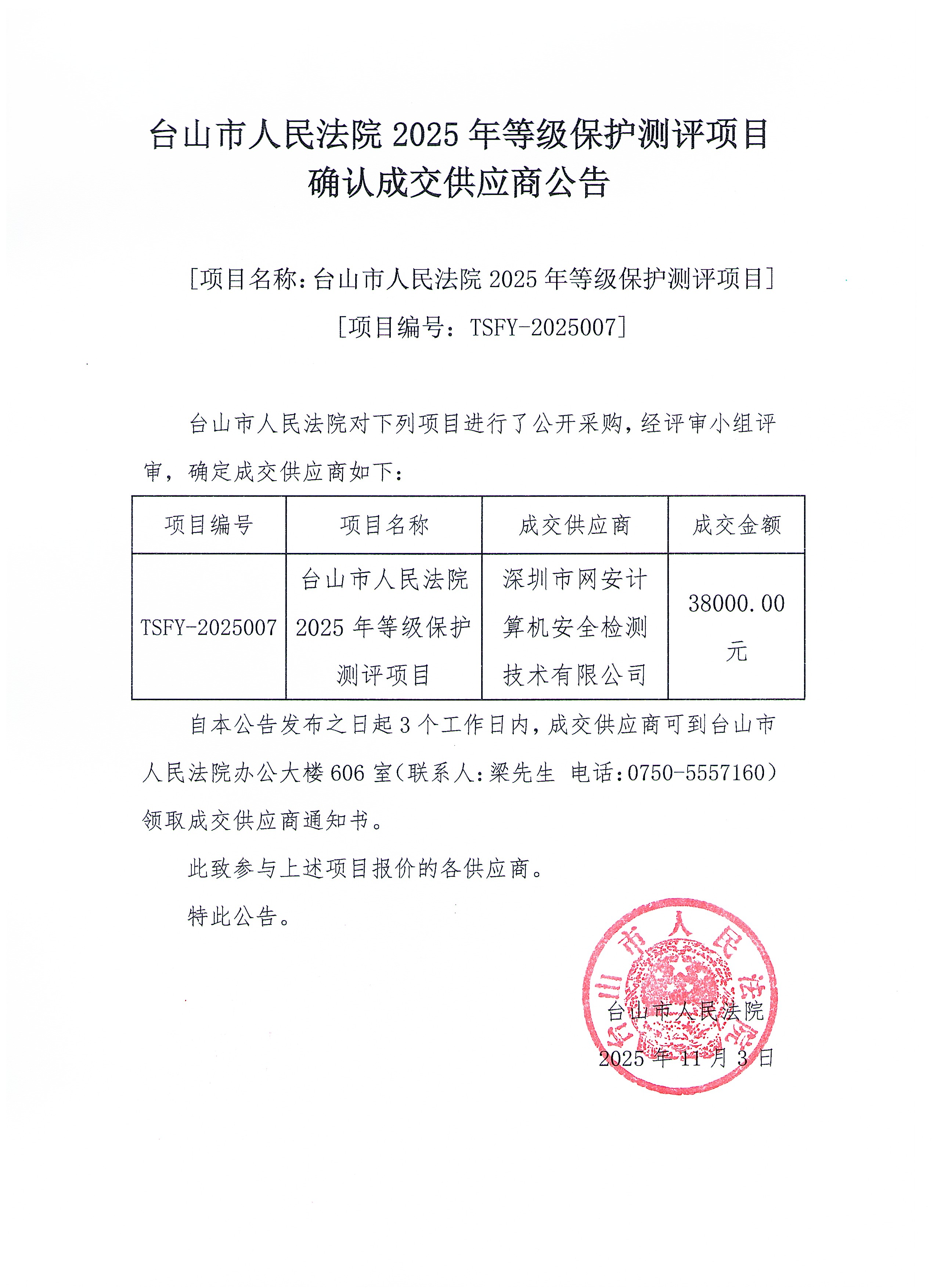台山市人民法院2025年等级保护测评项目确认成交供应商公告