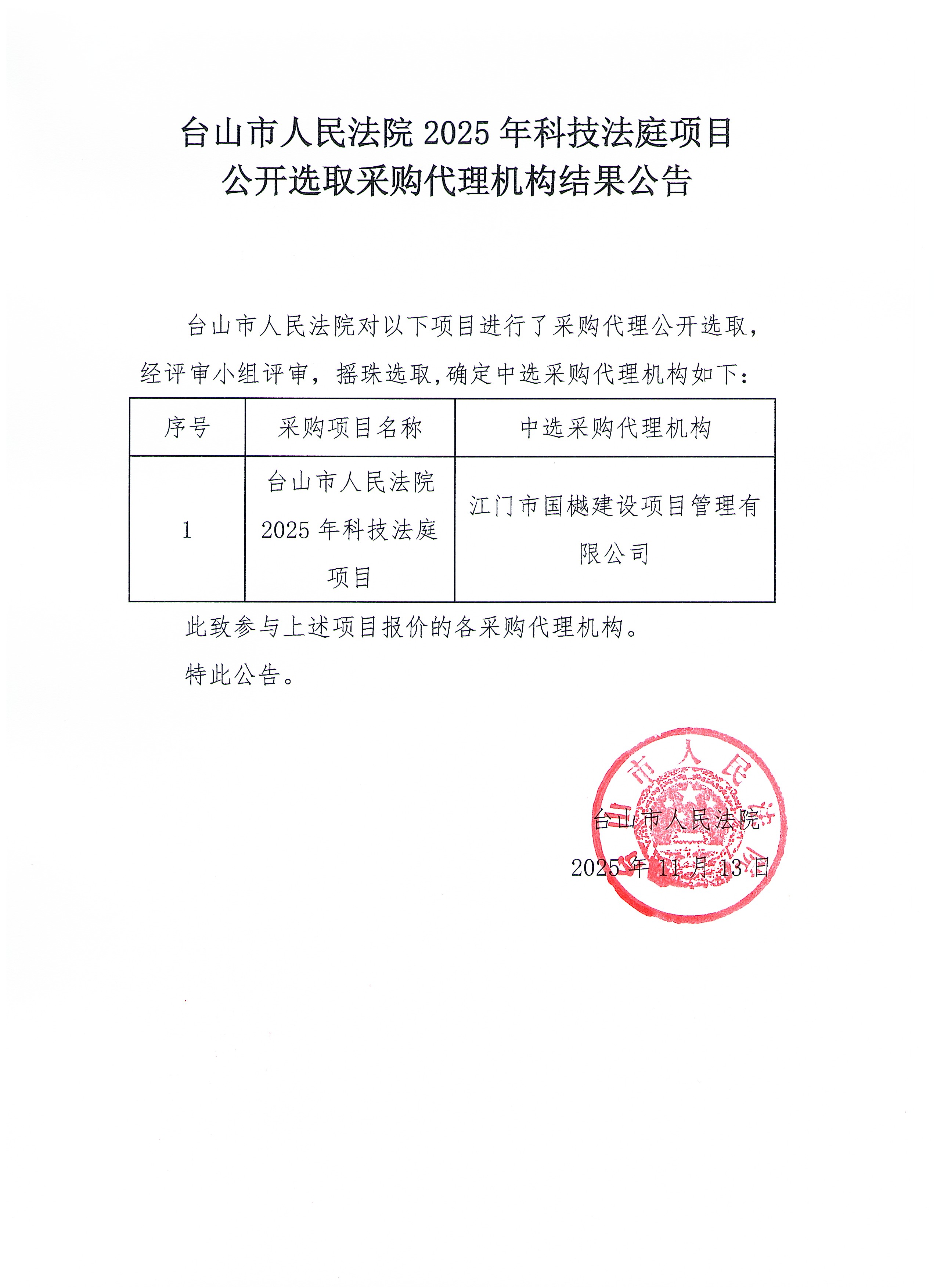 台山市人民法院2025年科技法庭项目公开选取采购代理机构结果公告