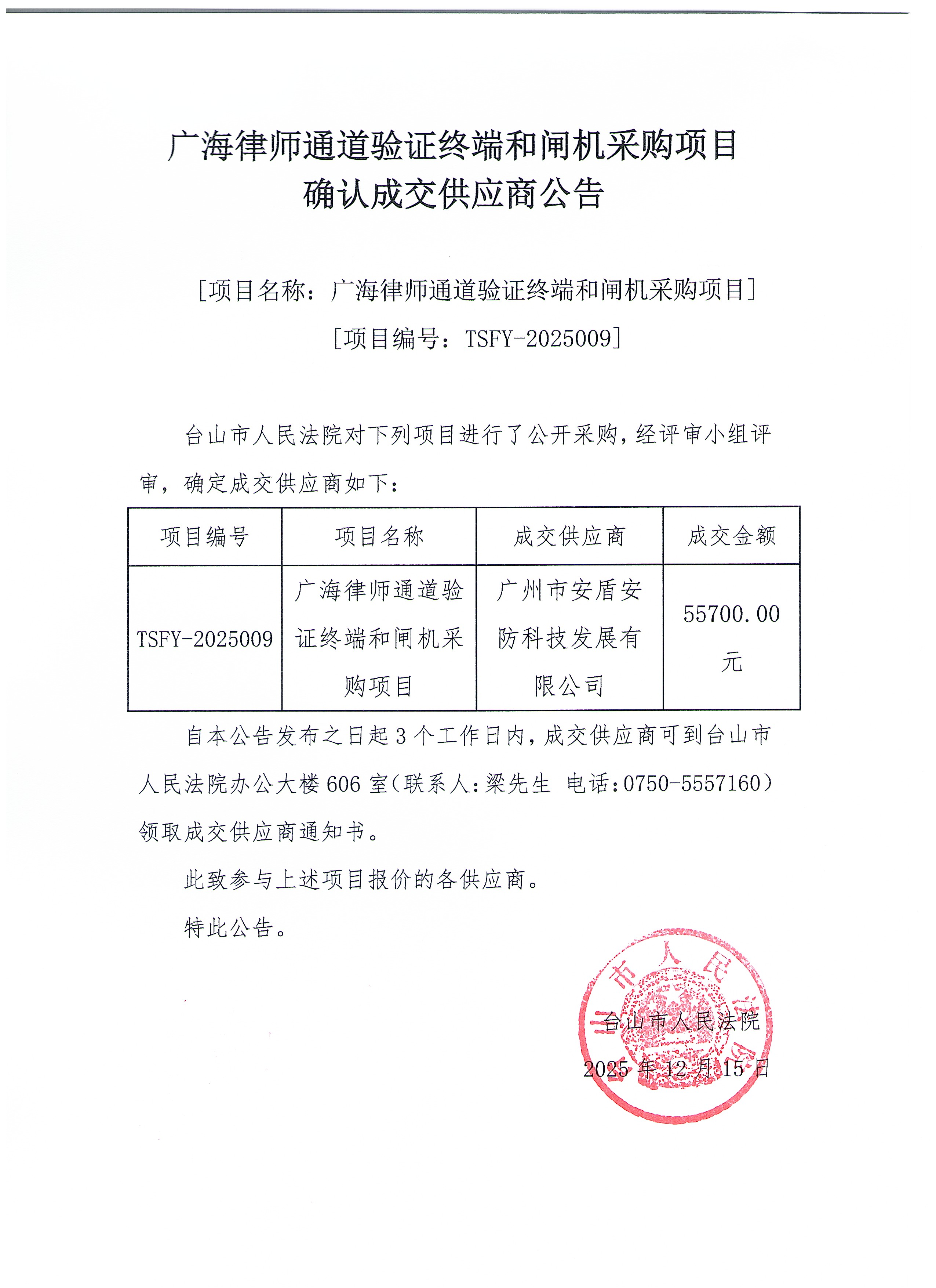 广海律师通道验证终端和闸机采购项目确认成交供应商公告